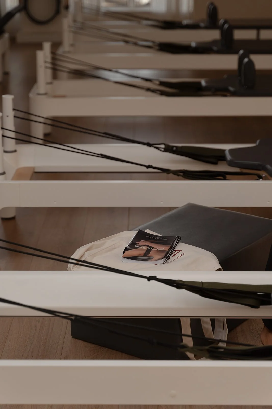 Empty medical rehabilitation beds with black straps and a booklet on a chair.